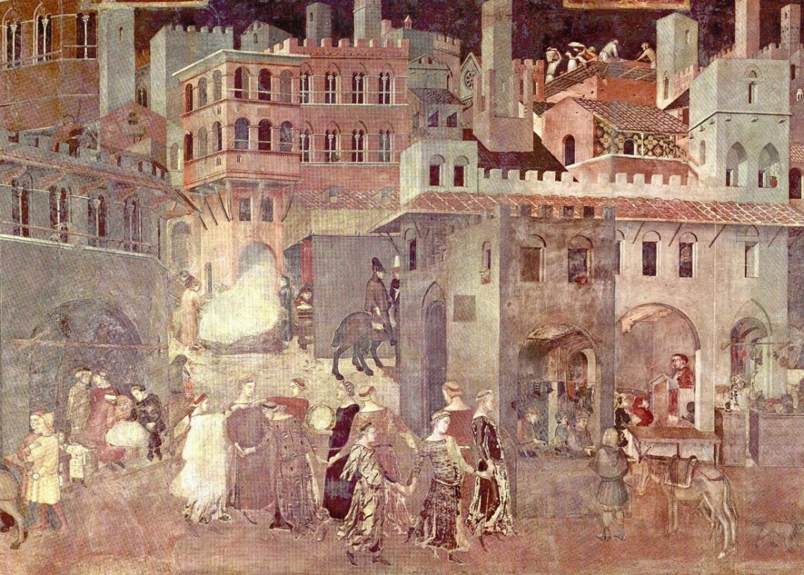 רפובליקת הסוחרים והבנקאים בסיינה היתה אז בשיא גדולתה. תשעת חברי מועצת העיר נבחרו על ידי משלמי המסים מתוך העשירים והישרים ביניהם. עשירים – מכיוון שמרבית הוצאות הציבור נפלו על כתפיהם, ישרים – כי אזרחי סיינה הבינו שאם לא יוכלו לסמוך על נבחריהם, הרפובליקה שלהם תיפול. אבל תשעת הנבחרים ובוחריהם היו רק בני אדם וידעו שאדם מועד לעולם לפיתויי היצר הרע.