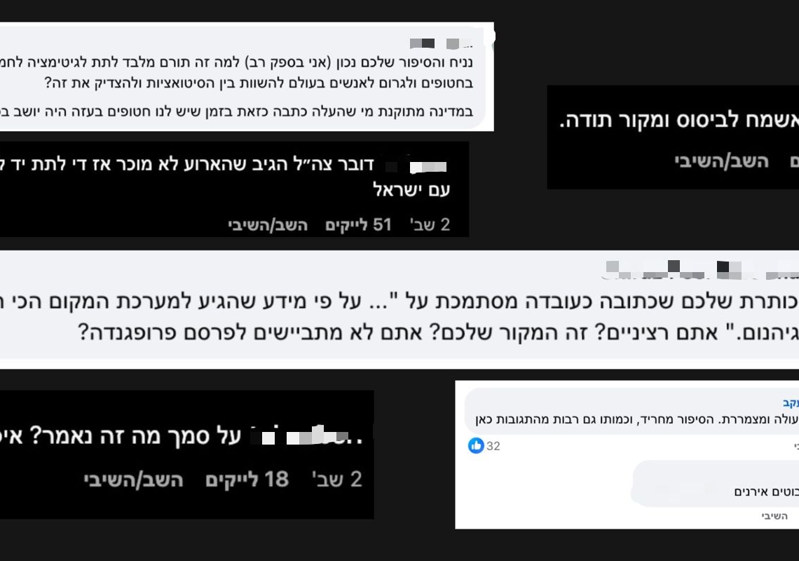 מהן אותן הוכחות שדרשו המגיבים? איזה ביסוס חסר להם? צילומים של אותו קשיש עם חגורת הנפץ קשורה לצווארו? שרידי גופותו? השמות המלאים של המקורות? לא. כפי שהבהירו רבים מהם, לעיתים באותה תגובה ממש, הבעיה היא עצם הפרסום. ״למי זה עוזר שכל העולם יודע את זה?״, בשאלה הזו, ששאלה אחת מקוראות הפרסומים שלנו ברשתות החברתיות, מובלעת המחשבה שהפרסום מוכוון, מתוזמן ונועד להכפיש את הצבא או לפגוע במעמדה של ישראל בעולם.