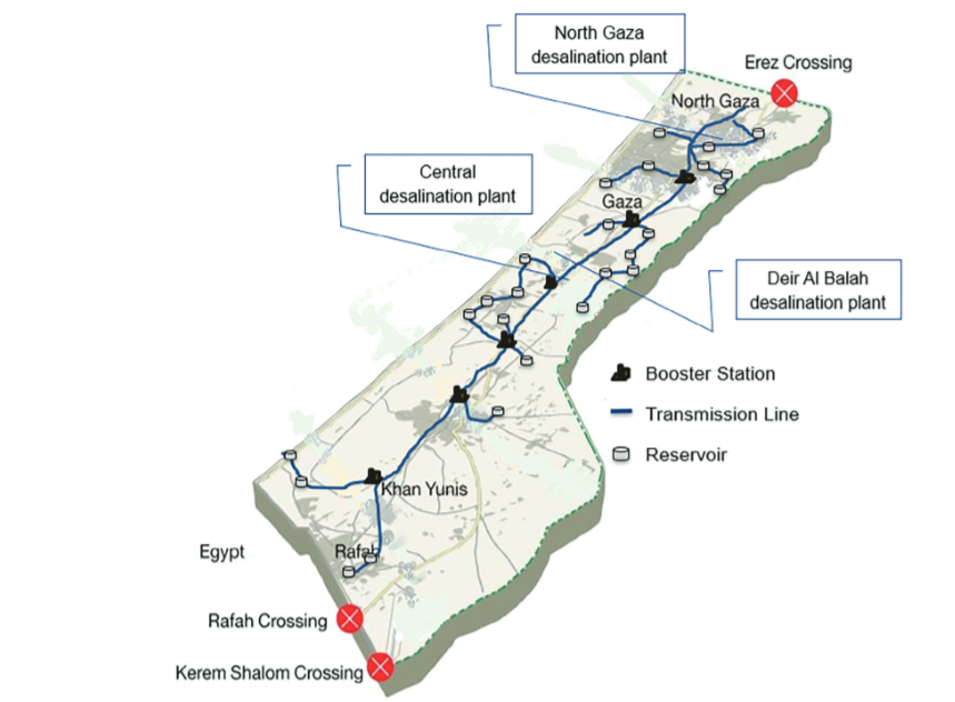 מים הם צורך בסיסי ביותר, ללא אספקה בטוחה ואמינה של צורך בסיסי כמו מים, לא ניתן להתקדם לבריאות, חינוך או פיתוח כלכלי. כלומר, מים אינם רק עניין הומניטרי אלא תנאי יסוד ליציבות אזורית. לכן, כל תוכנית לשיקום עזה חייבת לכלול את האלמנטים שלהלן. ראשית, יש להקים מתקני התפלה בקנה מידה אזורי שיכולים לספק מים לאוכלוסיית הרצועה. כדי לענות בצורה בסיסית על הצרכים העירוניים של רצועת עזה, נדרשת תפוקה שנתית של כ־103 מיליון מ"ק מים מתוקים בשנה. תפעול מתקני התפלה אלה דורש צריכה משמעותית של חשמל, ולכן הפתרון לבעיית המים בעזה בהכרח יהיה כרוך ביכולת לפתח גם את משק האנרגיה ברצועה, וזה יכול לכלול הקמה של מתקנים לייצור חשמל וייתכן שגם יבוא חשמל ממצרים או מישראל. מתקני התפלה בקנה מידה נרחב יוכלו גם לצמצם את השאיבה של המים מאקוויפר החוף ולהאט את הקצב של חדירת מי הים לאקוויפר זה המשותף גם לישראל ולמצרים.