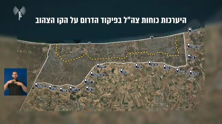 לאחר שנחתם ההסכם, ביום שישי שעבר, הציג צה"ל את קו ההיערכות החדש במסגרת נסיגת הכוחות שישראל התחייבה אליה על פי ההסכם ומתווה טראמפ הקרוי ״הקו הצהוב״. בעוד לפני ההסכם שלט הצבא בקרוב ל-90 אחוז מהשטח, הקו הצהוב הסיג את הכוחות אל מחוץ לריכוזי האוכלוסייה הגדולים בעיר עזה בצפון, במחנות המרכז ובמואסי שבמערב חאן יונס שבדרום, והותיר לצבא שליטה ב-53 אחוזים בלבד מהשטח.