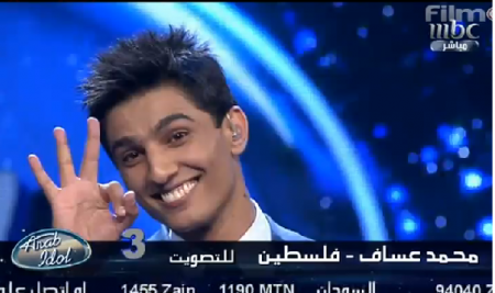 מוחמד עאסף מסמן שלוש אצבעות בתוכנית ערב איידול. צילומסך