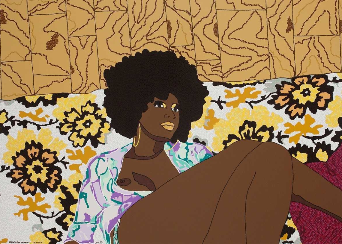 הדפס משי של מיקאלנה תומס, 2006. מתוך תערוכת אמנות אפריקאית עכשווית שהוצגה במרכז האמנות בנצרת