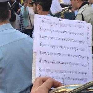 אחרי הסיבוב בשכונה, תזמורת המשטרה מסתדרת בשתי שורות. לפי סימן, הנגנים שולפים דפי תווים שהכינו מראש, ומניחים מולם. המצעד עוצר עד שיתארגנו, והילדים שרים שירי פורים. המנצח מניף שוב את השרביט, מניד בראשו, וכשהוא מוריד את השרביט התזמורת פותחת במחרוזת קצרה של שירי החג.