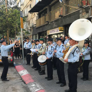 העדלאידע של ביה״ס ביאליק רוגוזין מתל אביב עוברת ברחוב פלורנטין, עם תזמורת המשטרה