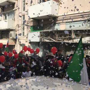 בכל כיתה, כך נראה, יש מישהו שעומד עם דגל ישראל גדול. בכיתות המתקדמות יותר זה אחד הילדים, בכיתות הנמוכות אחד ההורים. השלט 'קמפוס חובק עולם' מוחזק על ידי ההורים ומורים שמובילים את הכיתות. "תראה איזה חמודים", אומר בעל חנות אחד שיצא החוצה לבעל החנות לידו, "אני מקווה שלא יגרשו אותם". "את אלה לא מתכוונים לגרש", מגלה חברו בקיאות, "מגרשים רק את הרווקים, לא את המשפחות".