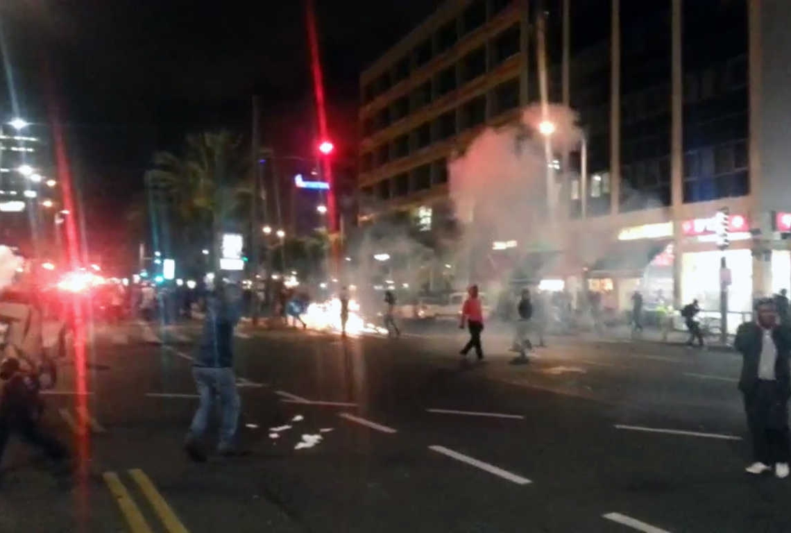 ההפגנה ממשיכה בכיכר רבין. חפצים מתחילים לעוף לכיוון השוטרים. בקבוקי מים וחפצים אחרים. עשרות שוטרים על מדרגות העירייה מחכים בציוד פיזור הפגנות מלא להוראה להסתער.