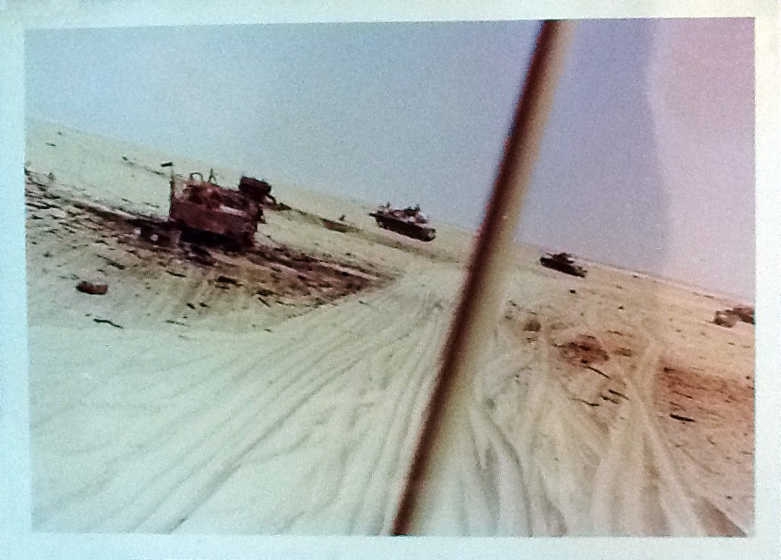 בתמונה למעלה: נגמ"ש צ750421 נוסע על עקבות טנקים. "לך תמצא במדבר הזה גופות". צילומים: גרשון גורביץ'
