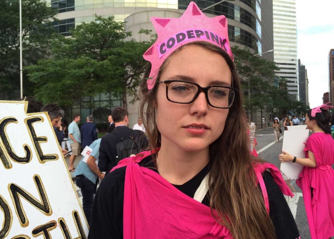 ״אני פעילה ב-Code Pinkובאתי לכאן כל הדרך מלוס אנג׳לס כדי להעביר את המסר של שלום. מפה אמשיך לוועידה הדמוקרטית כדי להפגין גם שם ולדבר על כך ששני המועמדים הם War –Hawks(נצים). טראמפ אולי לא נצי כמו קלינטון כי הוא עוד לא היה בשלטון, אבל האופן שבו הוא מתבטא – הוא מתיר אלימות. קלינטון אולי לא משתמשת בשפה כה אלימה, אבל גם היא נצית מאוד וכאשר היתה לה אופציה להשתמש בדרכים דיפלומטיות היא העדיפה מיליטריזם.