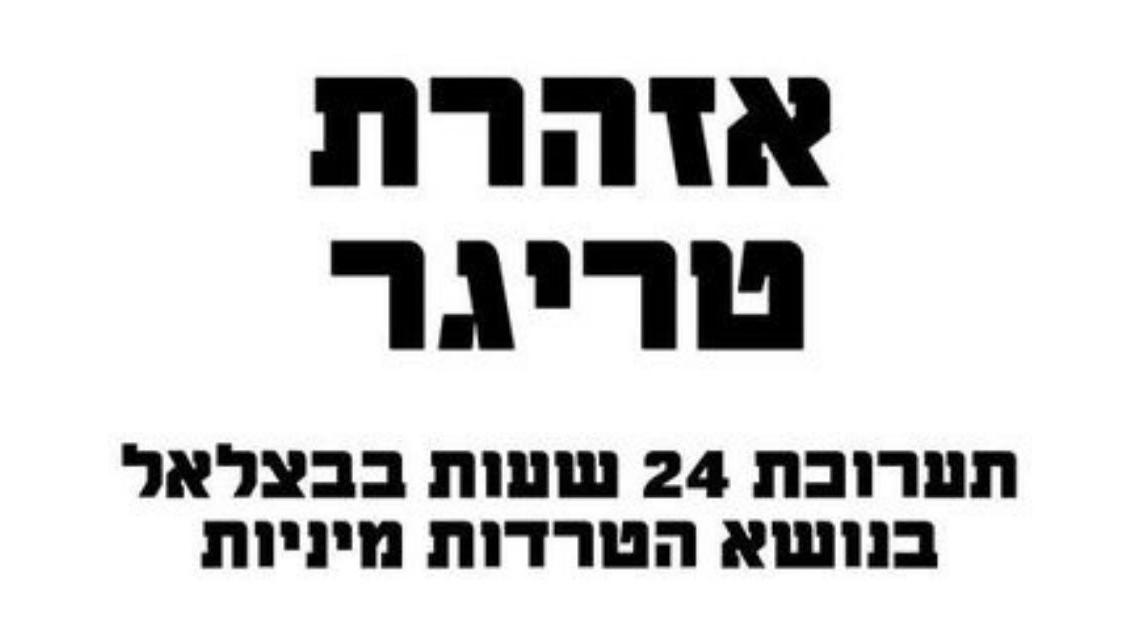 "אנו הדור החדש שמוכן ליישם את ערכי השוויון והצדק באופן אקטיבי, להציף לפני השטח את הפגיעות המגדרית שמתקיימת בחברה שלנו וכן, גם בתוך גבולות האקדמיה הכה מוכרת. אנחנו מזמינות אתכן ואתכם לשלוח עבודות המתייחסות לכותרת 'אזהרת טריגר'. העבודות הנבחרות יוצגו בתערוכה בחסות איגוד הסטודנטים והסטודנטיות".