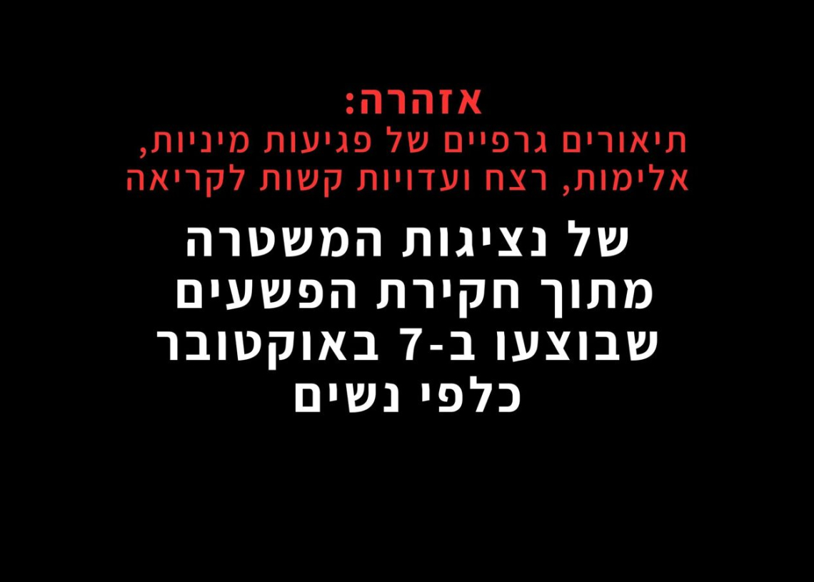 "'היתה סיטואציה שבו כופפו מישהי ואז הוא אנס אותה והעבירו אותה מאחד לשני. הם היו מחופשים לחיילים, שמעתי צעקות בערבית. הבחורה שהם אנסו, היא היתה בחיים, עמדה על הרגליים, היא דיממה מאזור הגב. היתה עוד מישהי שניסיתי לזכור מה היא לבש ואני לא מצליחה. אני זוכרת שהמחבל משך לה בשיער. היא לא הייתה לבושה, הוא חותך לה את השד, זורקים לה את השד לרצפה ומשחקים עם זה וממשיכים למשוך אותה. אני זוכרת מישהו חודר אליה ואז יורה לה בראש. לא מרים את הראש, יורה לה בראש כשהמכנס שלו למטה'".
