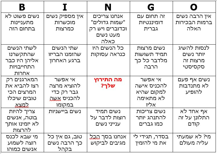 כשהתחלתי לספור מרצות ומרצים בכנסים נתקלתי ב"בינגו תירוצים", שמסכם את כל התירוצים להיעדר נשים דוברות בכנסים. חלק מהתירוצים נשמעו לי כל כך מופרכים שלא תארתי לי שבתוך פחות משנה אני אשמע ואקרא במו עיניי ובעברית כמעט את כולם. חלק מהפנינים לפניכם: