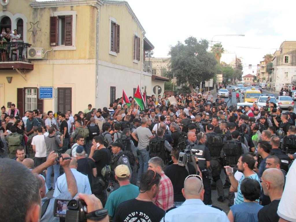 כשהגענו אל נקודת האיסוף החדשה כבר עמדו מעבר לכביש מולנו כמה מאות אנשים, עטופים בדגל ישראל שזועקים "מוות לערבים" ו"לכו לעזה". די נדהמנו. לקח לנו דקות ארוכות להתחיל את ההפגנה. בשלב זה עוד היה נדמה כי קיים איזה שוויון מספרי בין הקבוצות. אנחנו זעקנו "יהודים וערבים מסרבים להיות אויבים" וקראנו סיסמאות אחרות בזמן שמחצית מחברינו נדחקו אל גינה ציבורית, ממתינים לתחילת הצעדה הקצרה שתוכננה להחליף את התהלוכה בציר מוריה. חיכינו לעוד אוטובוסים של מפגינים כדי לצאת לדרך. בזמן הזה, זרמו עוד ועוד מפגיני ימין ובשלב מסוים היה אפשר להבין כי למשטרה אין מספיק כוחות כדי להשתלט על ההמון.