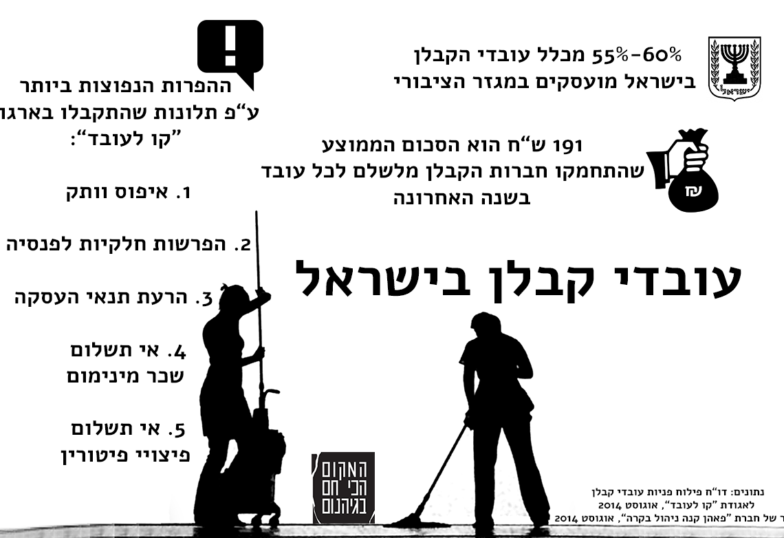 ככה, בפשטות וללא שמץ של מרירות, תיאר באוזני מ', עובד ניקיון ותיק אך צעיר בשנים, כיצד הוא מפנה מקום בין ערימות נייר הטואלט בחדר הזעיר והטחוב שהוקצה לו ולחבריו עובדי הניקיון במוסד ציבורי ירושלמי מוכר. מ' הוא תושב מחנה פליטים בירושלים, בעברו היה מפקח של חברת ניקיון גדולה ומוכרת, אך משעה שהחל להתרעם על פגיעה בתנאי העסקתו, החליטה החברה להמאיס עליו את העבודה ולגרום לו להתפטר. מאז הספיק להיקלט בחברה אחרת, אך בכך לא תמו צרותיו. לתדהמתו, מספר שבועות לאחר קליטתו, קיבל שיחת טלפון מהמעסיק החדש ובה נמסר לו כי חברת הניקיון הקודמת יצרה אתם קשר והזהירה אותם לבל יעסיקו אותו, שכן לטענתם – ביצע עבירת גניבה בעבר. האם ייתכן שהדבר קשור לעובדה שמ', בעזרת עמותת "קו לעובד", תובע את חברת הניקיון הקודמת ממש בימים אלו? הייתכן שחברות הקבלן מקיימות ביניהן שיח של הלשנה על עובדים "סוררים" ובכך מונעות מהם למצוא עבודה חלופית? לאלוהי ההפרטה הפתרונים.