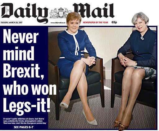 "Never mind Brexit, who won legs-it!" הכריזה הכותרת הראשית, לצד תמונת שתי המנהיגות בחצאיות. בתוך העיתון הופיע טור מאת שרה ויין שכותרתו "הנשקים החזקים ביותר ברשותן? הרגליים הללו!". הכותבת התרשמה יותר מסטרג'ן, שהישיבה שלה נראתה לה פלרטטנית ופתיינית יותר משל מיי. האינטרנט, כמובן, לא נשאר חייב. פוליטיקאים, עיתונאים, ושלל משתמשי טוויטר אחרים מיהרו להגיב על הסיקור הסקסיסטי.