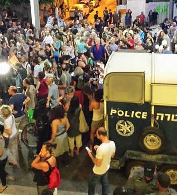 כמדי שבת מאז תחילת המלחמה (ועוד לפני כן, אחרי חטיפת ורצח הנערים שער, יפרח, פרנקל ובהמשך אבו-חדיר), התכנסו ארגוני שמאל, מאורגנים על ידי קואליציית נשים לשלום ומפלגת דע"ם, להפגנה גדולה בכיכר הבימה נגד הלחימה בעזה ובדרום, ובעד תהליך מדיני ופיוס. "לא ביקשנו אישור כי אין נאומים או צעדות", אומר ניר נאדר, מהמארגנים, מחצר משטרה גלילות, "אבל היה תיאום עם המשטרה, זו הפגנה חוקית".