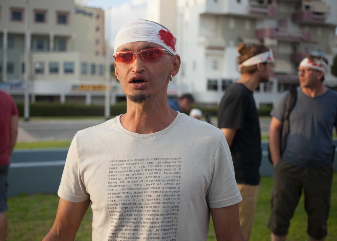 איש גבוה, עם תחבושת אדומה על ראשו הגלוח ומשקפיים עם עדשות אדומות, עומד בשולי ההפגנה ומדבר עם עיתונאים. בחור עם ראסטות ניגש אליו, מצביע על ההתקהלות, עושה תנועת הקאה ואף מחזק אותה במלים. הבחור הגבוה הוא אחד ממארגני ההפגנה. בפייסבוק הוא מופיע תחת השם נתניאל איידלברג, אך מבקש שיקראו לו רק "נתן" ומכנה את עצמו "אנרכיסט מהמרתף". לדבריו, "כוחות שאין להם עניין אמיתי לעזור", השתלטו על ההפגנה. כוונתו היתה לארגן תהלוכה תיאטרלית של "שבורי הראש" אל עבר משטרת אשקלון. אך הדבר לא מתאפשר, מכיוון שרוב המפגינים, אנשים מבוגרים, אינם ששים לסוג כזה של מחאה. הוא ממורמר מההיענות הנמוכה ליוזמת המחאה, אך לא מוכן לקבל את הגרסה ולפיה הסיבה היא שרוסים לא ממש סובלים מאלימות מצד השוטרים.