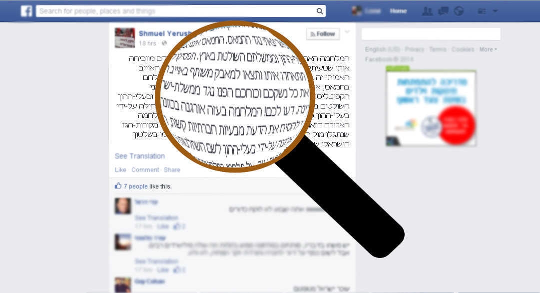 "כעיקרון אני לא חסיד של חמאס אבל אני גם נגד המלחמה. כשהתחילה מלחמת עזה, 'מבצע צוק איתן', פרסמתי הרבה טקסטים בפייסבוק שקראו להילחם בשלטון ולהפנות נשק נגד הממשלה, שפוגעת בשכבות החלשות", הוא מספר. בין היתר פרסם בשבוע האחרון סטאטוס שקרא "לצאת מעזה ולהפנות את הנשק נגד שרי ממשלה ובמקום לפגוע בנשים וילדים בעזה לפגוע בטייקונים ופקידים שמשרתים אותם".