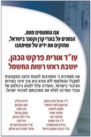 ביום רביעי בבוקר הופיעה בעמוד הראשון של "הארץ" מודעת רבע עמוד, עניין של 15 אלף שקל, בנוסח הבא: "אנו החתומים מטה, הנמנים על בוגרי קרן וקסנר בישראל, מחזקים את ידיה של עמיתתנו עו"ד אורית פרקש הכהן, יושבת ראש רשות החשמל.