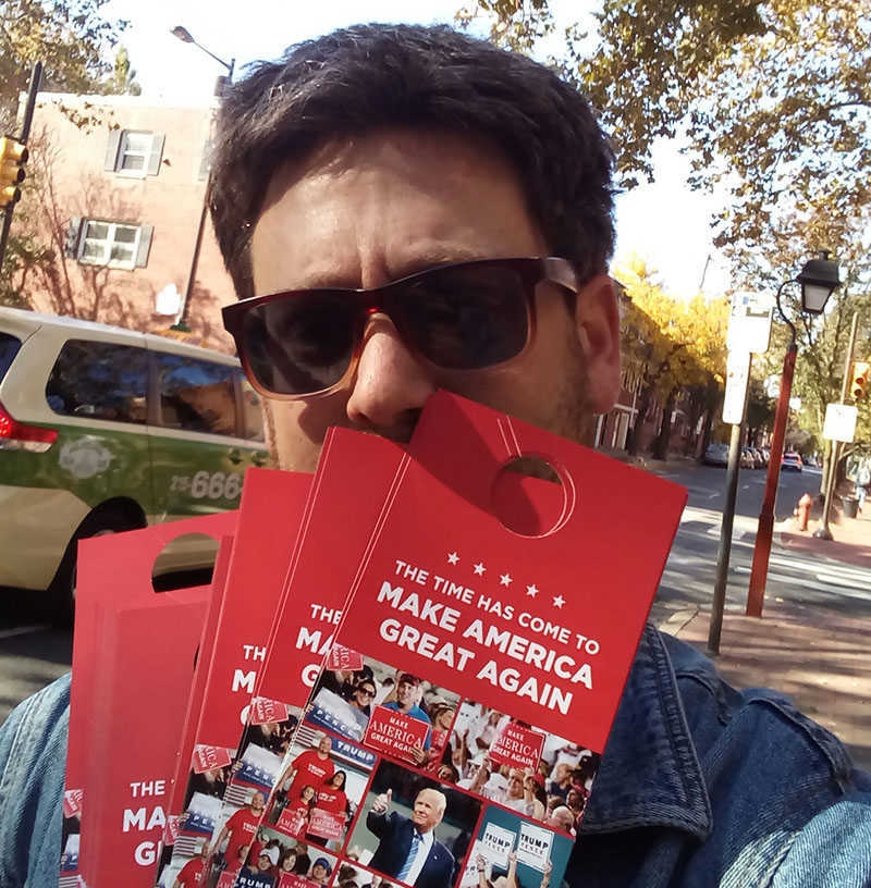 למחרת אני חוזר למטה טראמפ, ופוגש שוב את וואזיה הפעלתני. רוזי, פעילה אחרת, מלמדת כעשרה מתנדבים את התסריט שאני כבר מכיר מאתמול, ומתדרכת אותם איך יש לייעץ לבוחרים המתנדנדים של פנסילבניה בטלפון. אני, וואזיה, ג'קסון וג'סי נשלחים יחד להפיץ את הבשורה של טראמפ מדלת לדלת. בניגוד לשיטת הדפיקה על הדלת של מטה הילרי, אצל טראמפ פשוט מבזבזים תחמושת, ושמים פתקים על ידיות של הדלתות, כמו שליחים של סושי. ג'קסון מתווכח עם אישה שצועקת עליו שלא ישים את השלטים האלו והזבלים האלה על דלתה, והוא, כעונש, מצמיד לה לדלת חמישה פליירים של טראמפ.