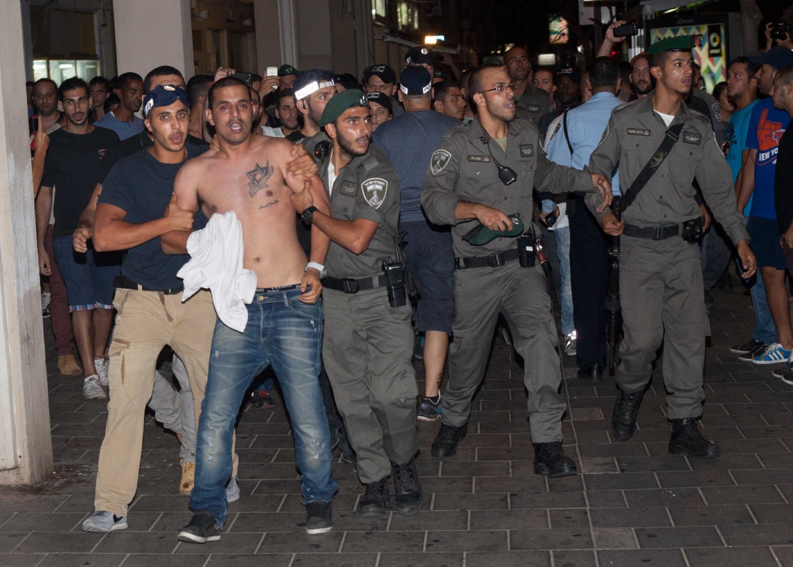 In the small public garden on Masarik square some 70 demonstrators congregate and start chanting praising songs to Kach and Kahana Chai (both are Jewish terrorist groups outlawed in Israel in the mid 1990's, following the assassination of Prime Minister Yitzhak Rabin), as well as all the other "greatest hits" from earlier in the evening. Some 20 meters from them, stands a platoon of riot police led by 2 officers and they don't hear a thing. No illegal praises to terrorists, no threats to parliament members. Nothing. As long as no one says something bad about the police, no arrests are made.