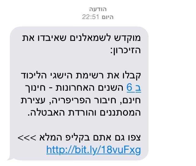 "מוקדש לשמאלנים שאיבדו את הזיכרון" – זו הייתה השורה הראשונה בהודעה הראשונה שהגיעה אלי (הם יודעים שאני שמאלן! הידד! אה, רגע – אם הם יודעים, למה הם חושבים ששמאלנים יצביעו ליכוד?) ואז ההודעה ממשיכה: "קבלו את רשימת הישגי הליכוד בשש השנים האחרונות – חינוך חינם, חיבור הפריפריה, עצירת המסתננים והורדת האבטלה. צפו!".