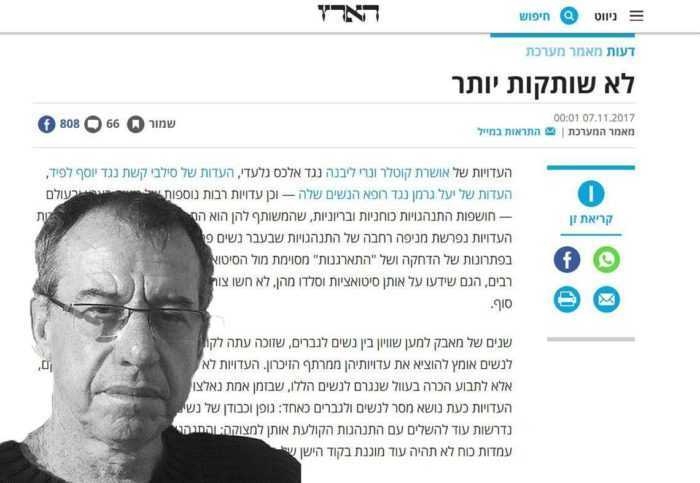 ומה עם גדעון לוי, שרק אתמול זרק בהערת אגב את הגישה המוכרת לעייפה ״כן, אבל יש דברים חשובים יותר״ על העיסוק באלכס גלעדי, וגבי הרמן על איך הפמיניסטיות שדרשו פיטורי מרצה שניצל מינית סטודנטית, למעשה חונקות את האירוטיקה? הארץ הפכה בקול אחד צורם לאיזו מלכודת דבש לאבירי הפטריארכיה הישנה והכוחנית, כאשר בקול השני מדברים עיתונאיות ועיתונאים מוכשרים, ערכיים ונמרצים המובילים את חזית המאבק בהשתקה וברדיפת נפגעות, ומסייעים במסע לחינוך הציבור על הכללים שהשתנו מזמן, אך רק כיום מתחילים לחלחל.