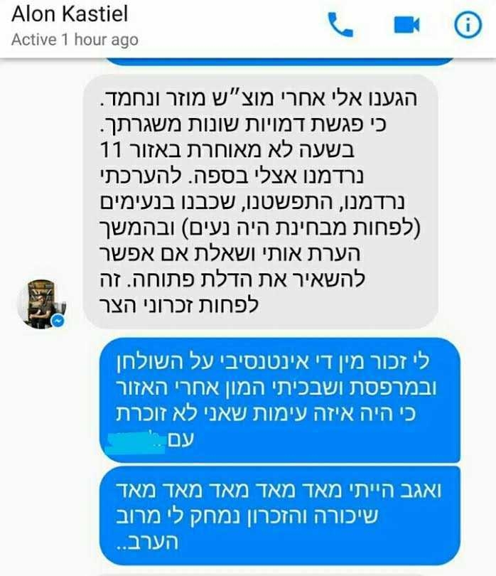 מאז התחלנו לפרסם עדויות על תלונות של נשים נגד אלון קסטיאל, על הטרדות ותקיפות מיניות, זרם התלונות לא פוסק. אנו מביאות כאן עדות נוספת, קשה במיוחד, הכוללת את צילומי השיחות שלהם לאחר האירוע.