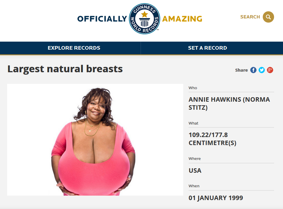 ציצים? אותו דבר. למה ציצים גדולים הם כאלה אטרקציה? מי אמר שזה 'יותר'? הרי משיחות עם נשים ברור שמי שיש לה שדיים גדולים לעיתים גם סובלת מהם. כאבי גב. חזיות שעולות כמו בית. נראות "פרובוקטיבית" מעצם מה שהטבע נתן, והתייחסויות בלתי נסבלות מהסביבה הגברית שעסוקה בציצים כאילו מדובר בתרופה לסרטן / טיסה לחלל / כרטיסים לסטאר-טרק בהקרנת בכורה. ובכל זאת הרי ברור לכולנו שמבחינה חברתית ציצים גדולים זה משהו להתייחסות. זו הסיבה שיש בשיאי גינס "האישה עם החזה הטבעי הגדול ביותר" (ראו תמונה), אבל אין שם את האישה עם החזה הטבעי הקטן ביותר.