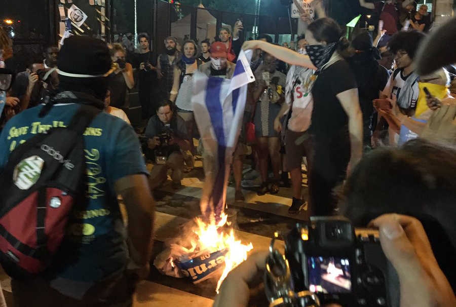 נתחיל מהסוף: על אף האווירה החיובית בתוך אולם הועידה הדמוקרטית, מפגינים תומכי ברני סנדרס סיימו את הערב בשריפת כרזות התמיכה בו, שריפת דגל ארה״ב וגם שריפת דגל ישראל. בעוד סנדרס נמצא בפנים, מצהיר על תמיכה פומבית (שוב) בהילרי קלינטון ומסב את כל הצירים של מדינתו, ורמונט, לטובת קלינטון באקט שהמשמעות שלו סמלית בלבד, הובילו תומכיו מהומות בחוץ. בסיום הלילה, ההפגנה של תומכיו התפזרה, ארבעה אנשים נעצרו, אך התמונה של דגל ישראל עולה באש, נותרה.