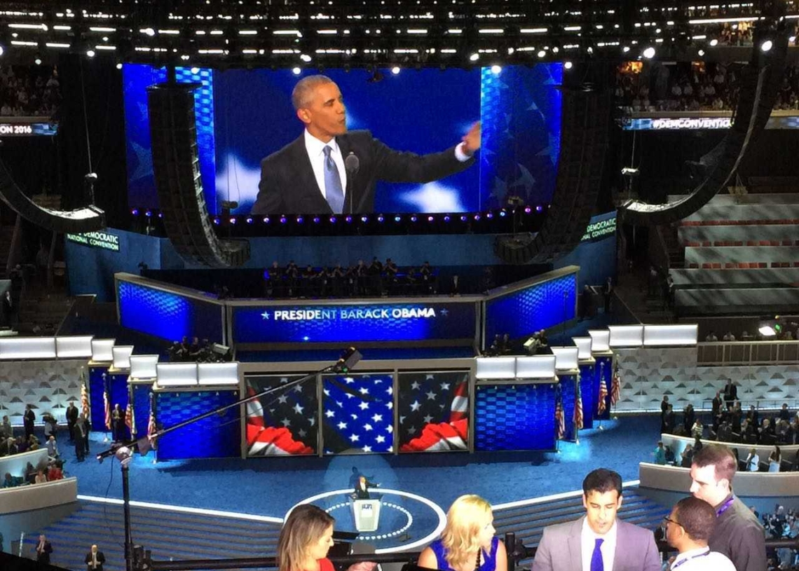 סיום היום ה 3לועידה. קלינטון הצטרפה לסוף הנאום של אובמה. הקהל פה השתולל pic.twitter.com/w4OrBaOgLQ