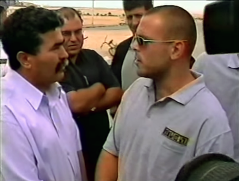 עמיר פרץ מול מאבטח. צילום מתוך הסרט "שביתה"
