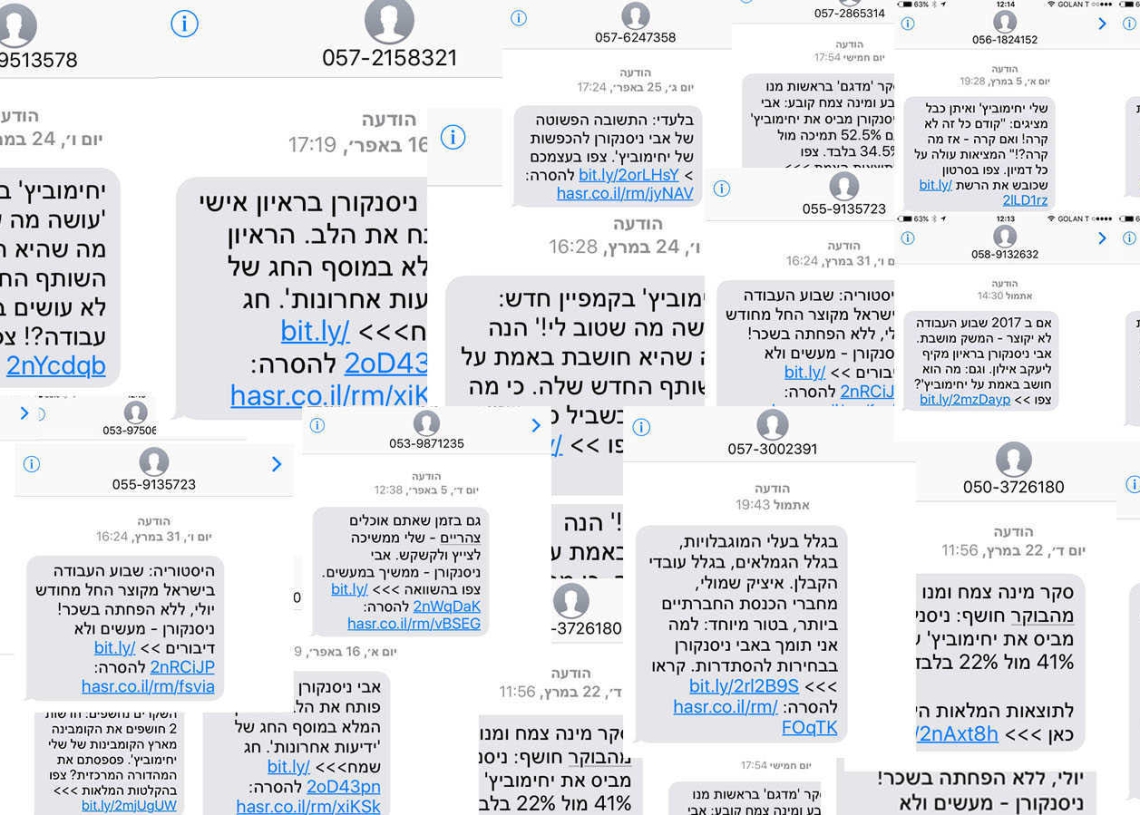 לפני חודשיים פרסמנו כתבה שניסתה להתחקות אחר מקורן של הודעות טקסט שמקבלים בעיקר חברי הסתדרות, אך לא רק. חוץ מהודעות בודדות עליהן היתה חתומה שלי יחימוביץ׳ (שגם משיבה למי שכותב חזרה), רובן עוסקות בהכפשת ח״כ יחימוביץ׳ וחלקן בתעמולה בעד יו״ר ההסתדרות אבי ניסנקורן. מקור ההודעות היה עלום, ללא הזדהות השולח וללא אפשרות להסיר את עצמך מרשימת הנמענים.