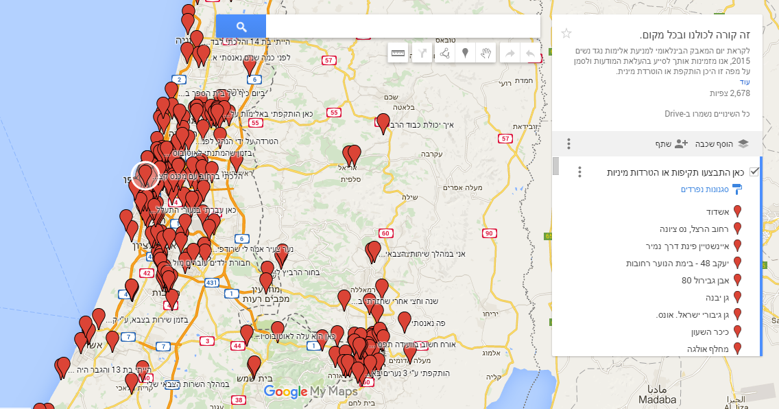 הצטברות הסימונים על המפה היא אקט פוליטי. אנחנו לא לבד. זה לא קרה רק לנו. הנה הנעץ שלי בנקודה שבה מישהי אחרת נעצה כבר קודם. הנה אנחנו יחד. כוח. והנעיצה היא גם אקט אישי. להוציא ממני ולשים שם, כמו אנדרטה במרחב. כדי שנוכל כחברה להביט ולראות שאין ביטחון לי, לאחותי, לבתי, לאמא שלי לא במרחב הציבורי ולא במרחב הפרטי – אין, אבל יהיה. כי אנחנו נשנה את זה באמצעות סימונים רבים, חינוך, קריאה לפעולה, נשנה את זה עם חברות הכנסת שלנו. נשנה את זה אתכם.