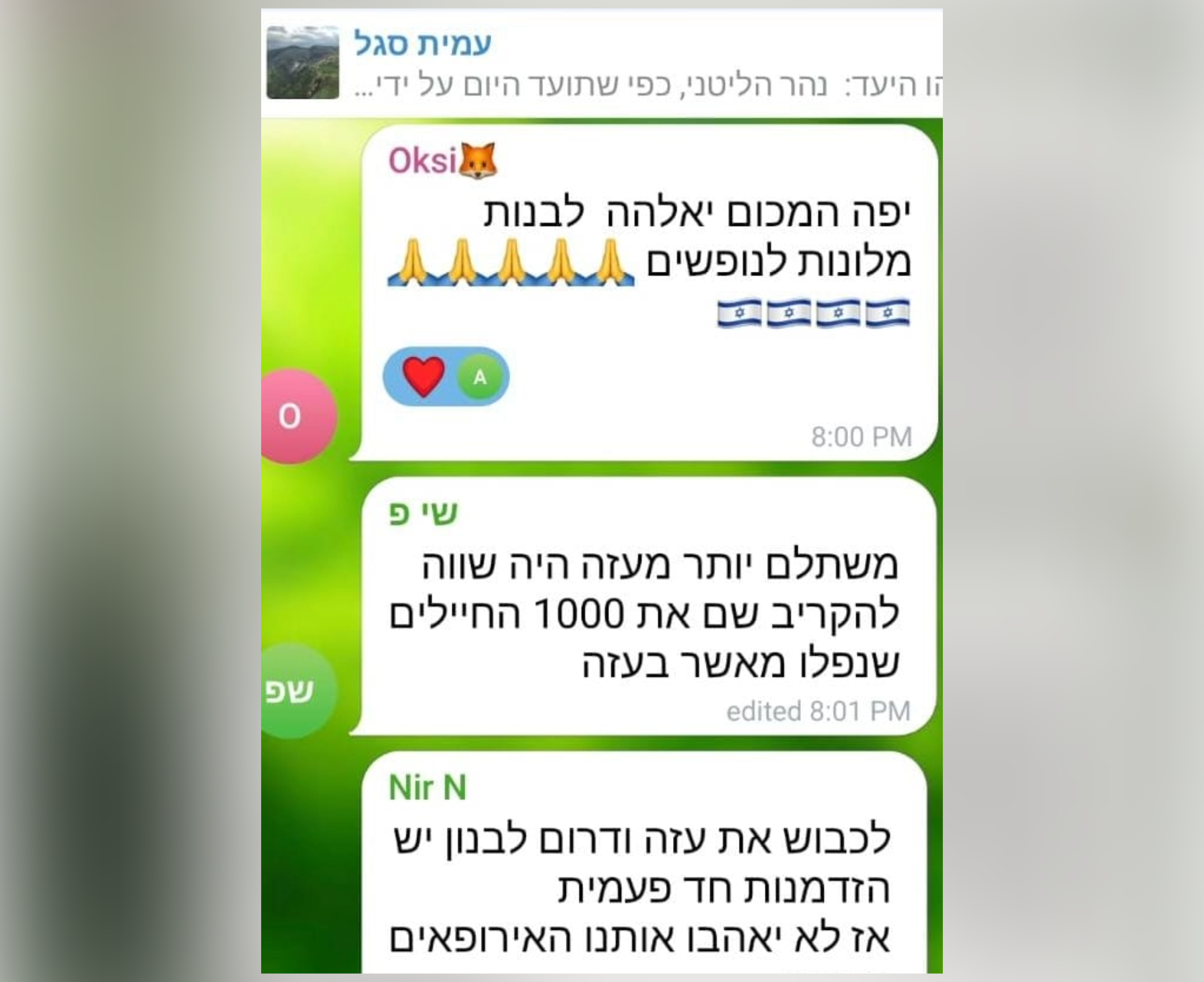 ואכן, חברי התנועה חגגו ניצחון קטן כאשר פורסמו השבוע (א׳) תמונות של חיילי צה״ל בנהר הליטני. ״משתלם יותר מעזה. היה שווה להקריב שם 1,000 חיילים שנפלו מאשר בעזה״, כתב אחד המגיבים בטלגרם, ואחר הוסיף: ״מקום מהמם. להפשיר קרקעות ואפשר בנייה. טיהור, כיבוש, התיישבות״.